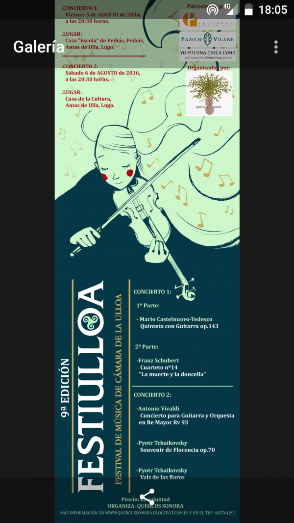 Y ya no voy a apurar más, que luego me subo a Galicia para ir a Festiulloa. Los que me seguís lo recordaréis del año pasado (ver post «Vacaciones de Persona»). Unos conciertos de música clásica gratuitos para conseguir financiación la Asociación de unos amigos, Quercus Sonora. El año pasado me comprometí a financiar la cuerda estructurada, que no sé muy bien lo que es, pero suena de puta madre. Y, como no, he cumplido mi objetivo.